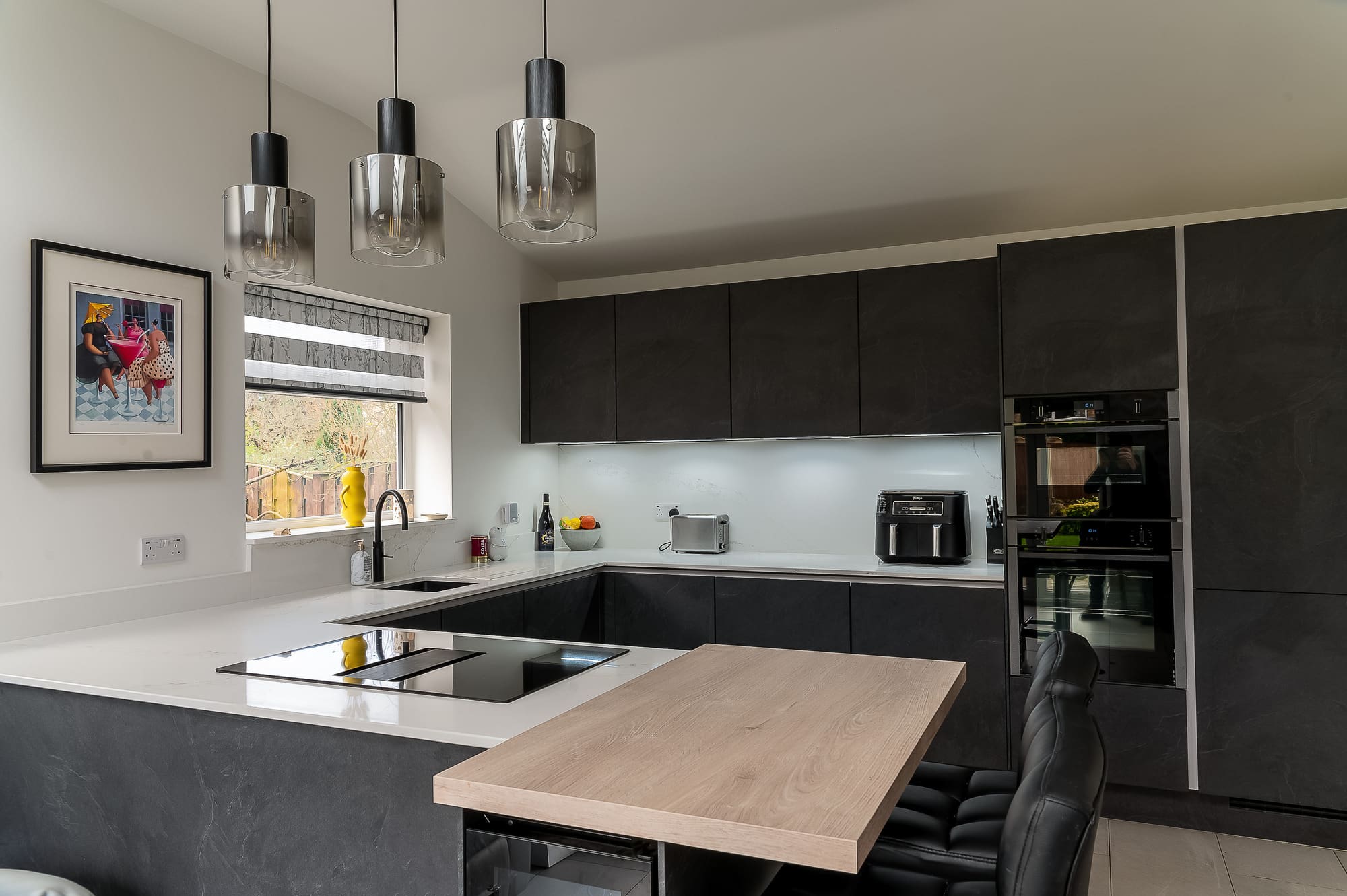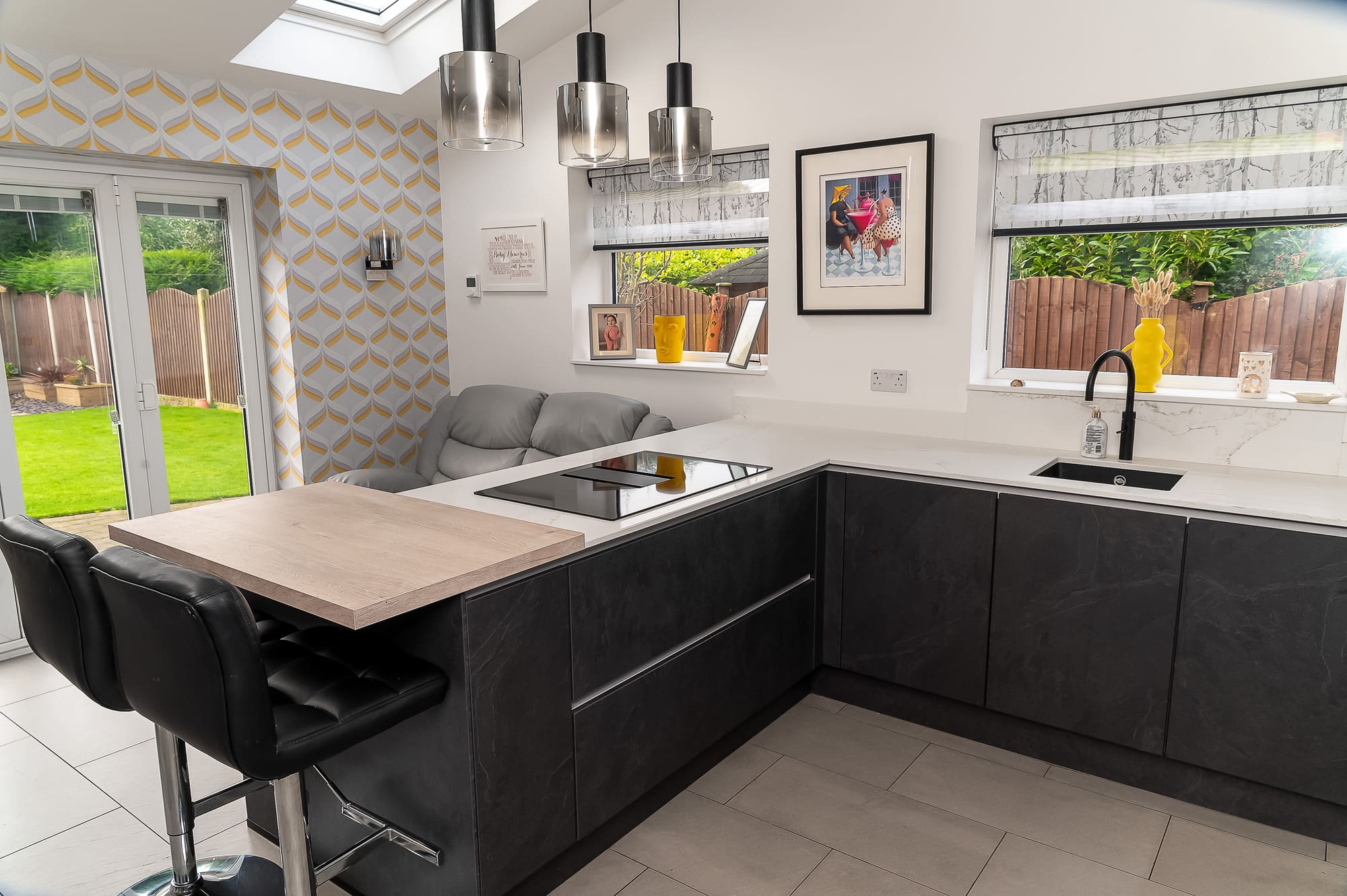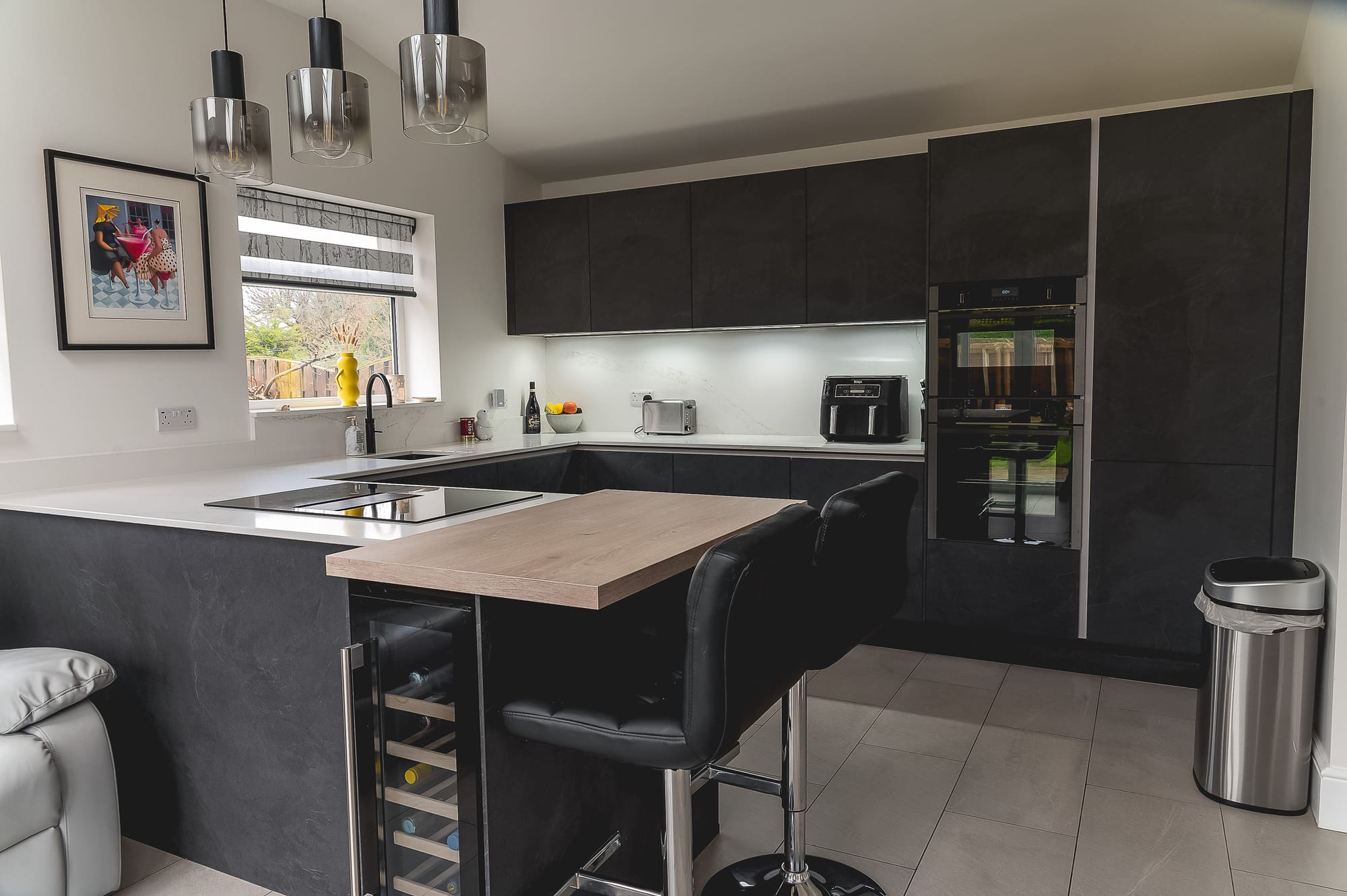 Warm wood-effect worktops bring natural contrast to the cabinetry, softening the darker tones and adding usability across the kitchen. A matching timber-effect breakfast bar offers comfortable seating and provides a sociable gathering point within the kitchen.