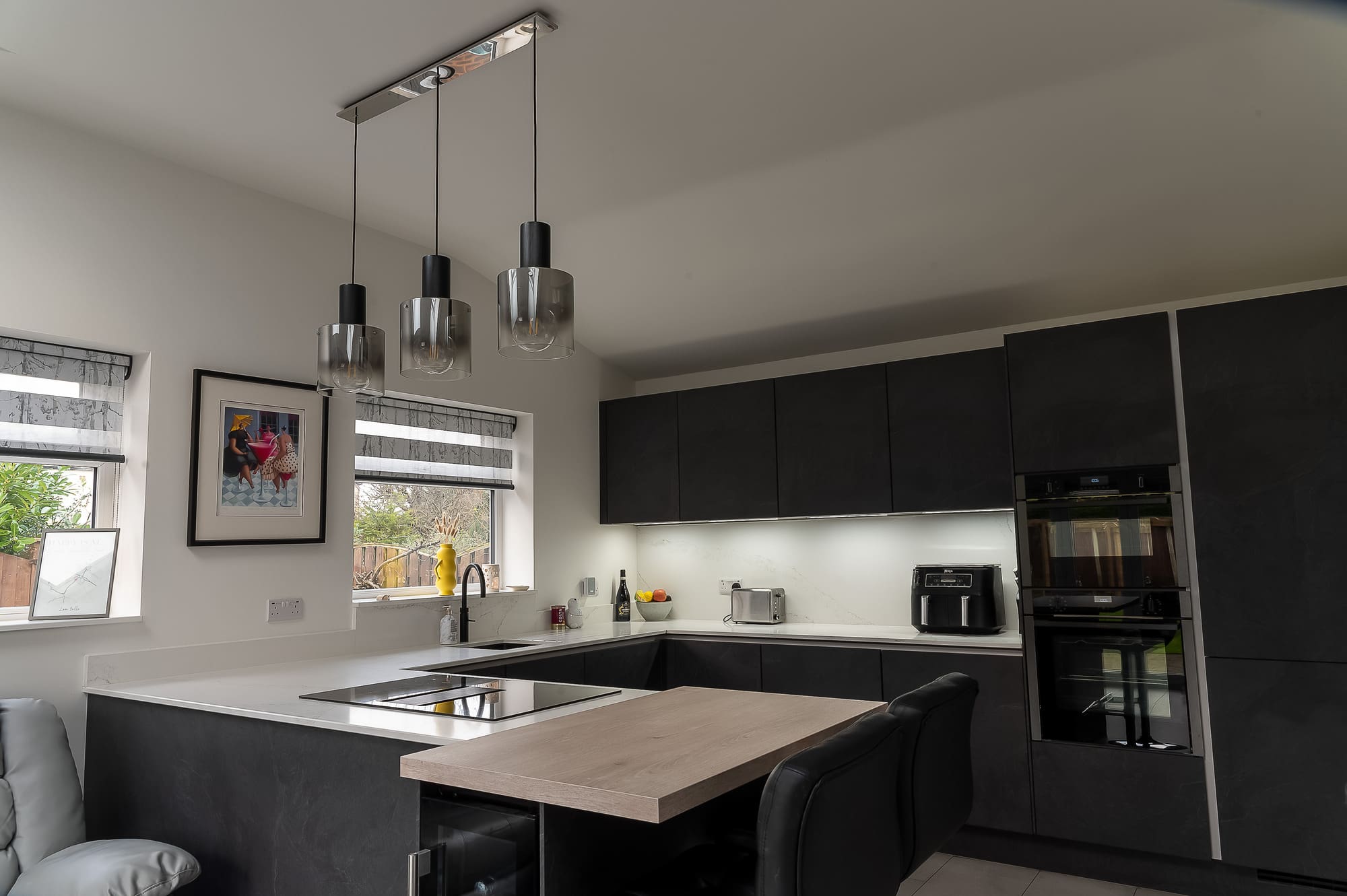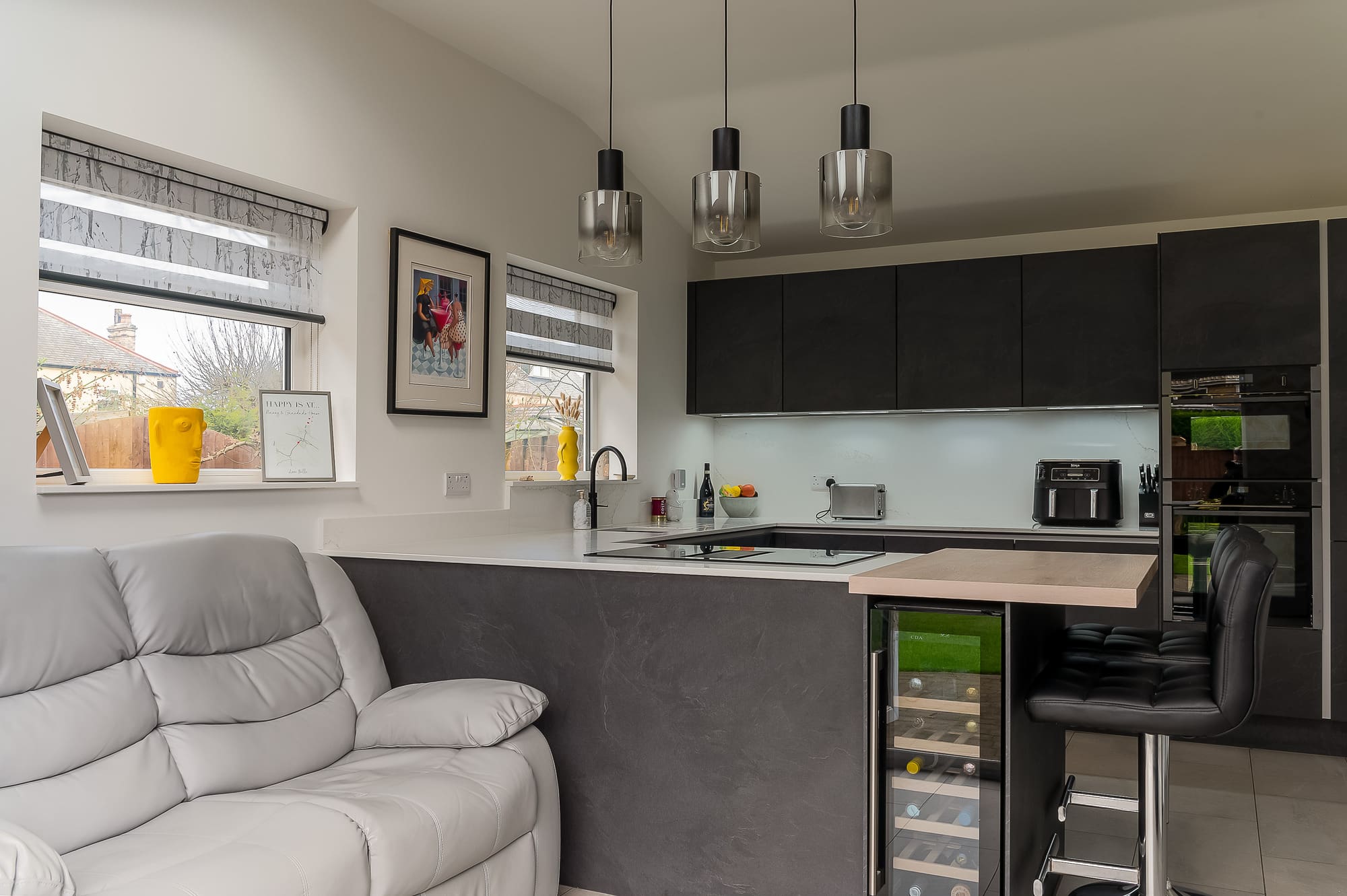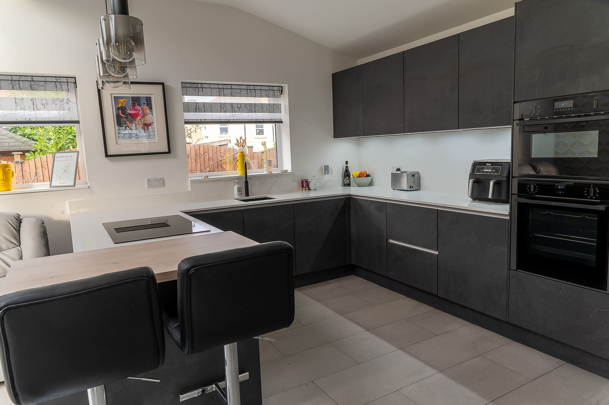 Warm wood-effect worktops bring natural contrast to the cabinetry, softening the darker tones and adding usability across the kitchen. A matching timber-effect breakfast bar offers comfortable seating and provides a sociable gathering point within the kitchen.