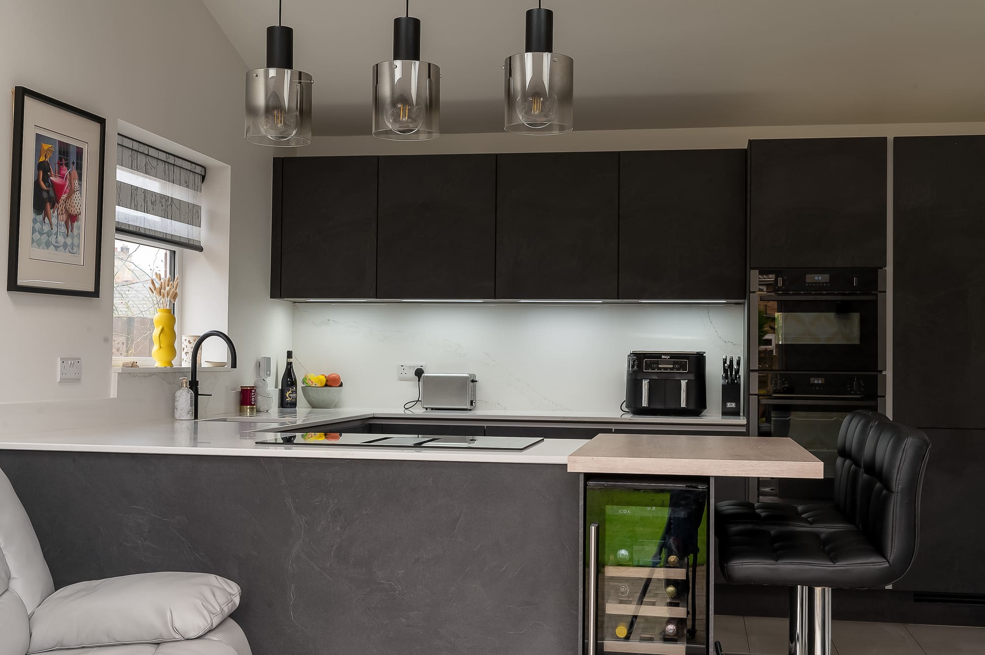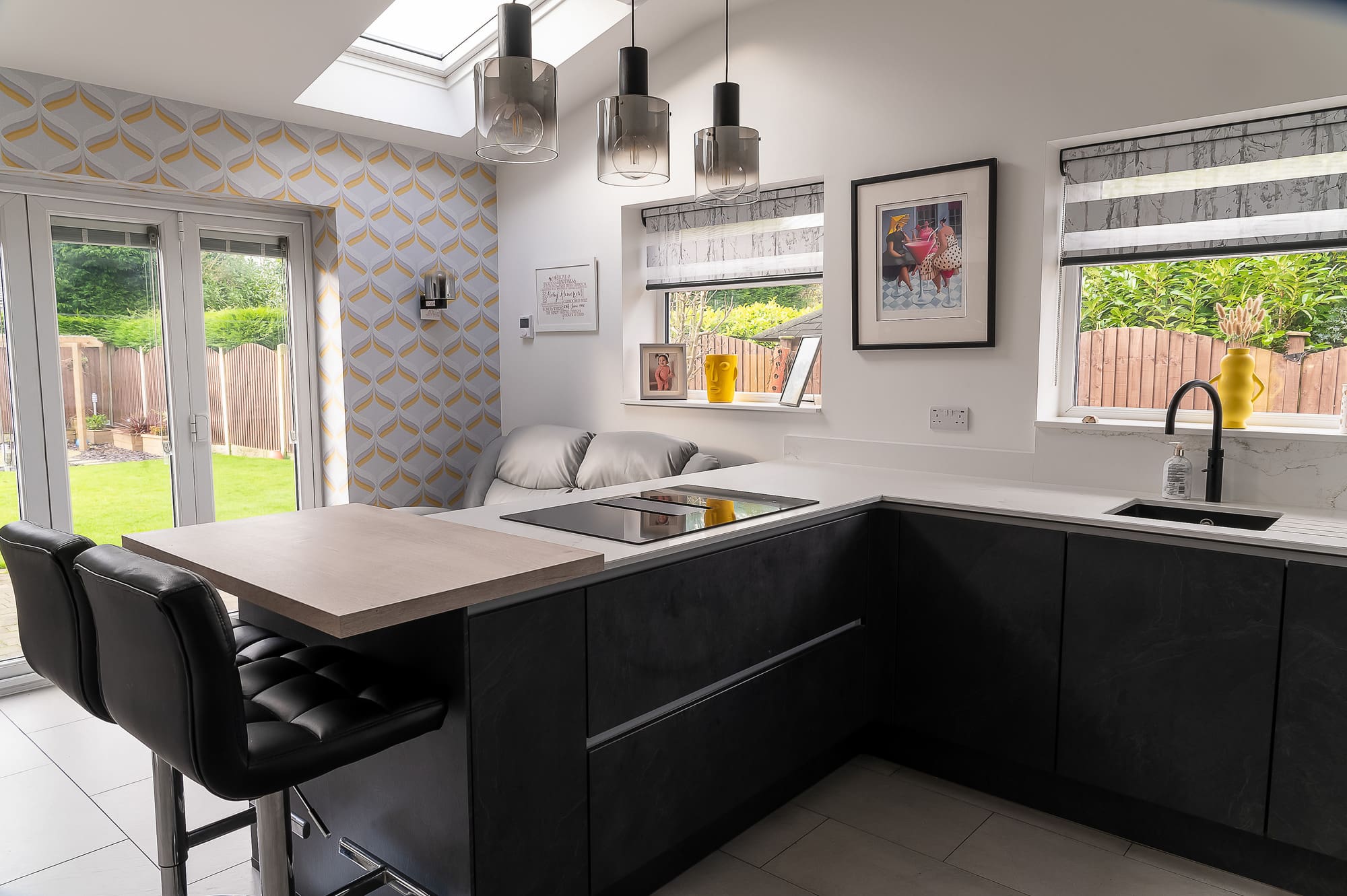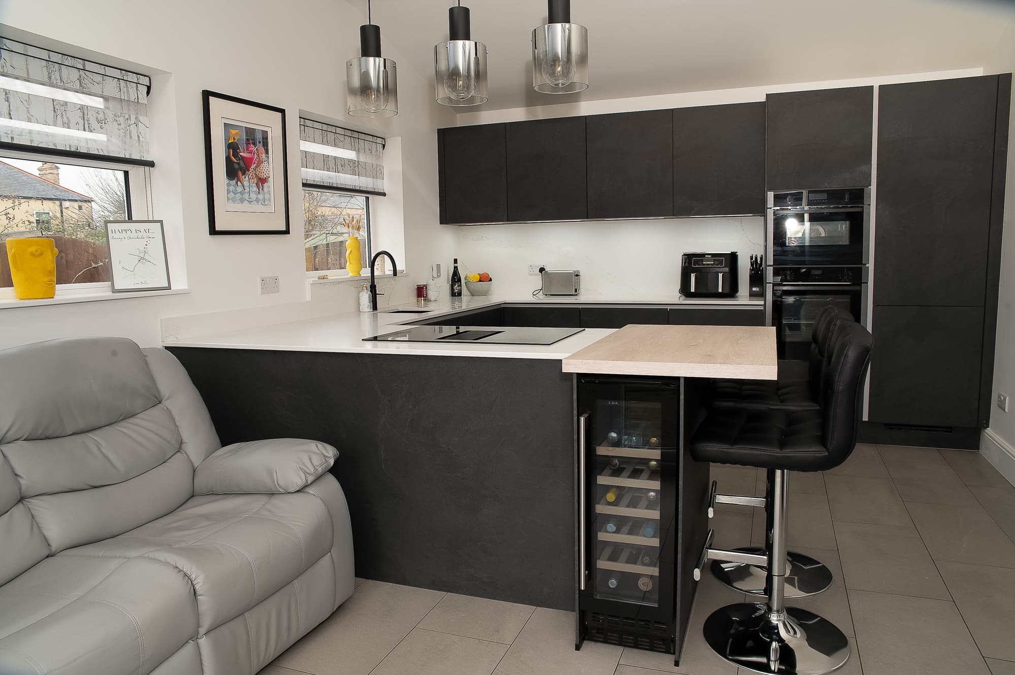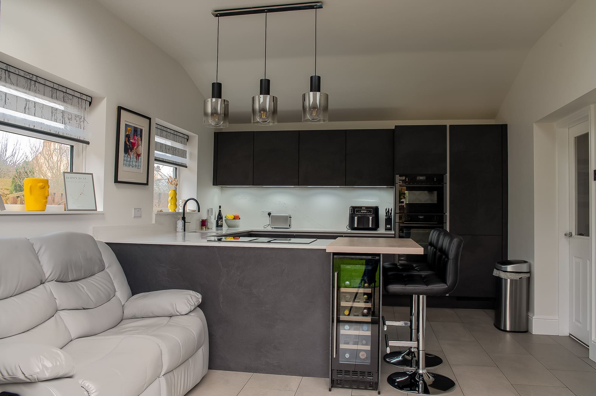 The standout feature of this kitchen is the textured black kitchen cabinetry. Its tactile finish creates depth and sophistication, offering a modern alternative to traditional flat matt surfaces. The dark kitchen tone is balanced with warm wood-effect worktops and soft grey seating, preventing the scheme from feeling heavy.