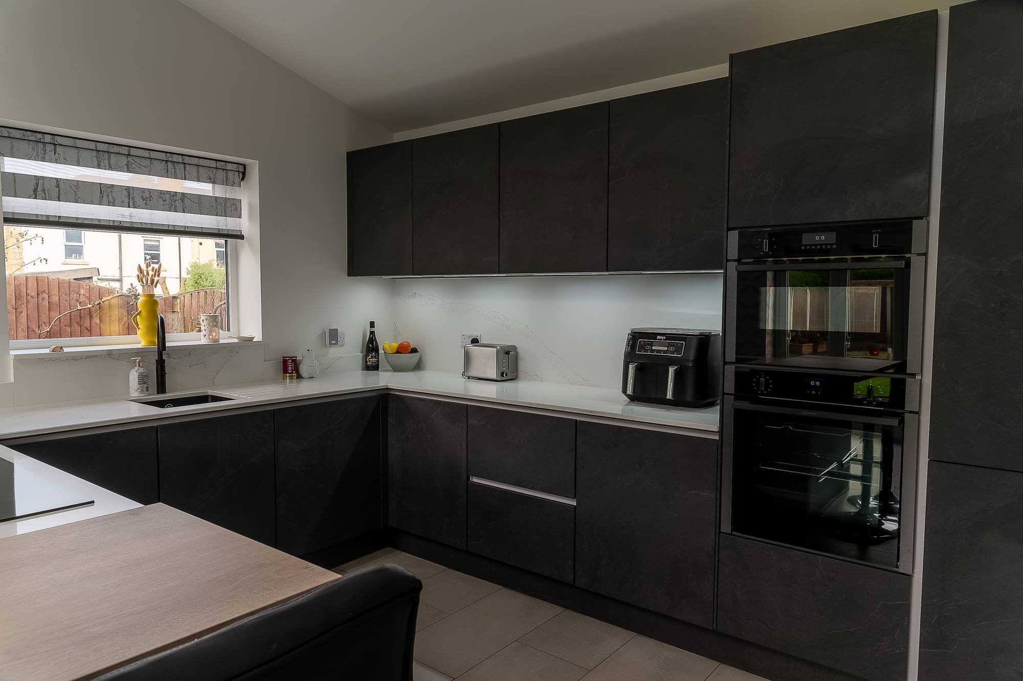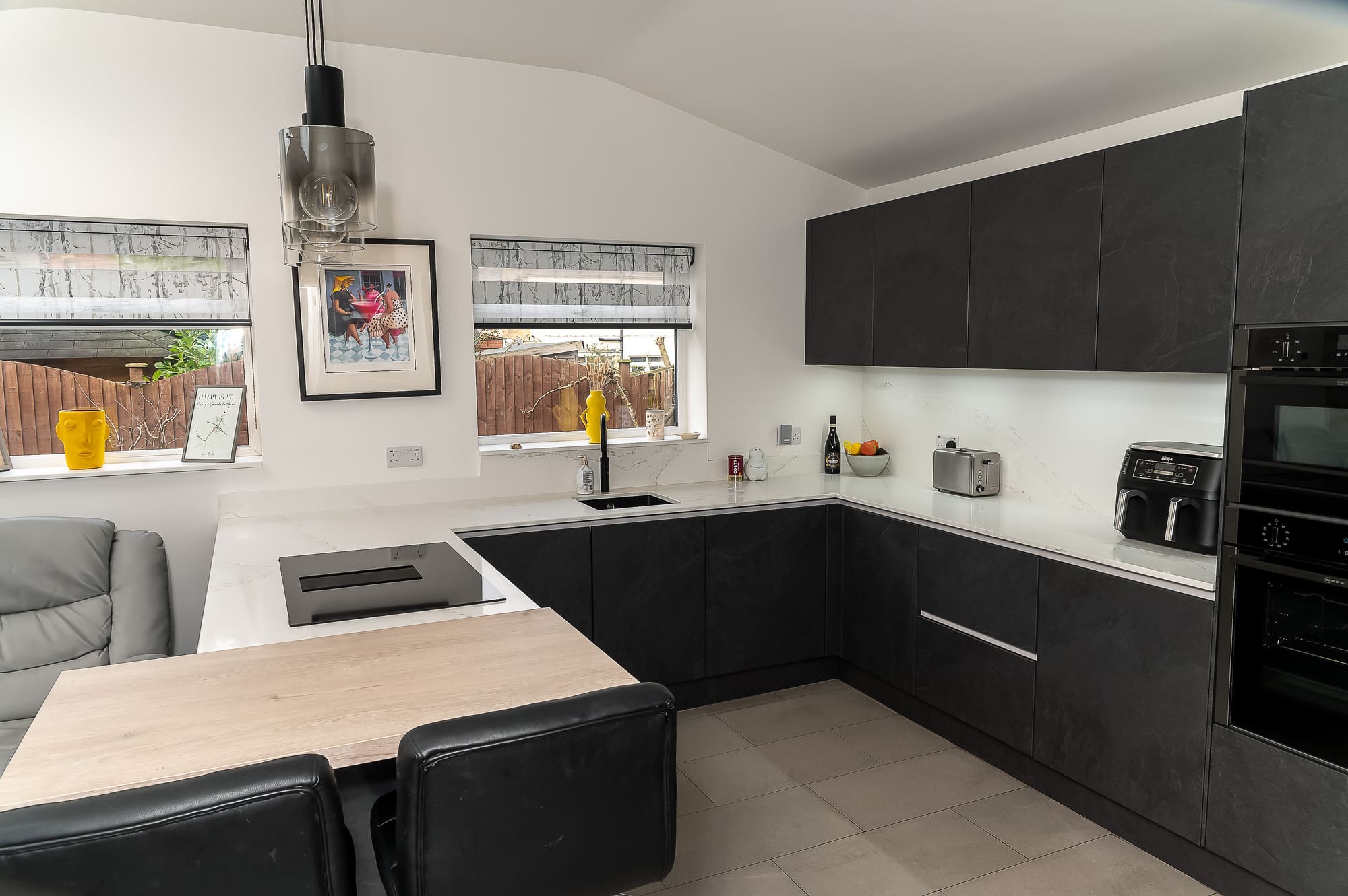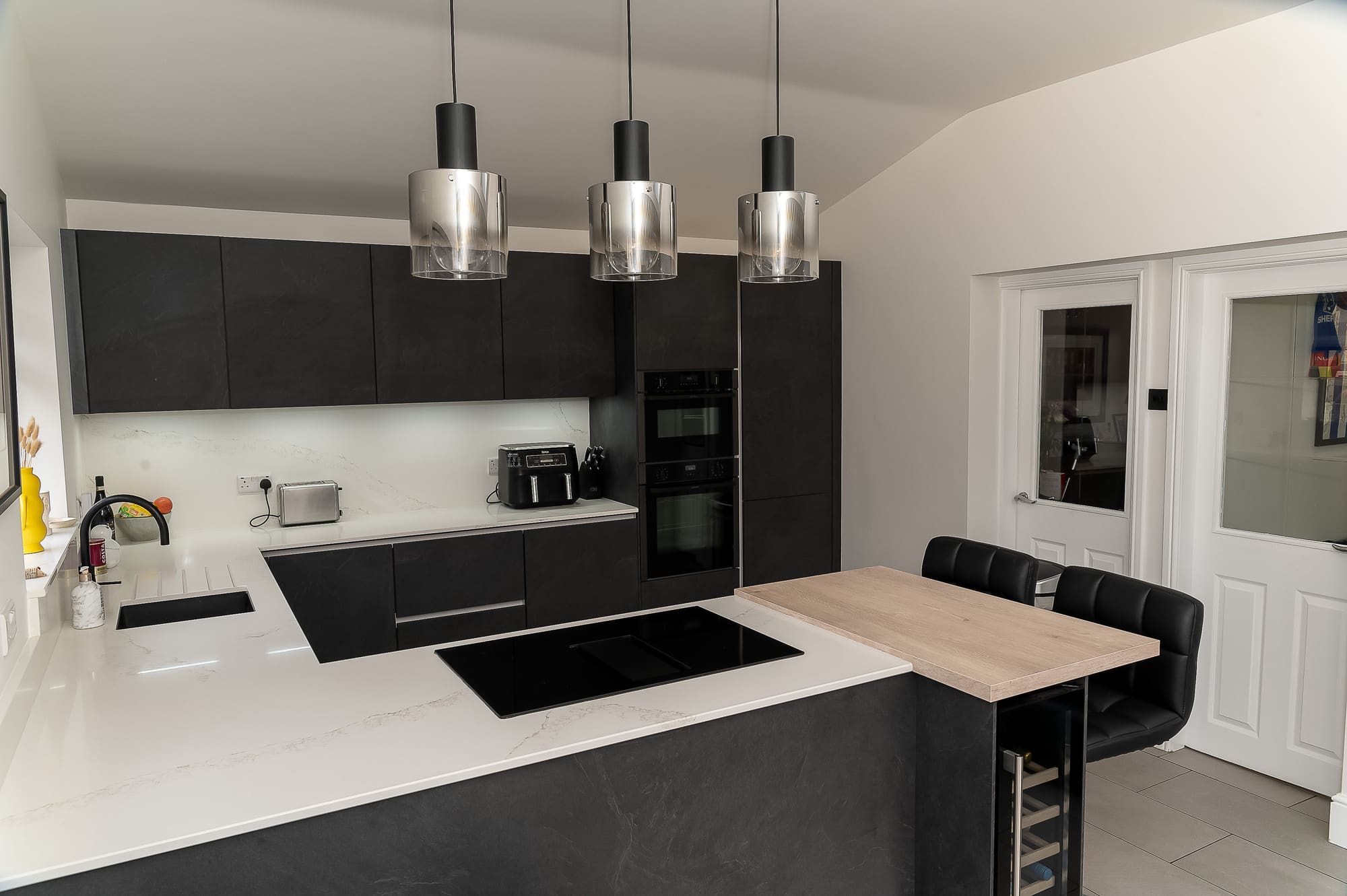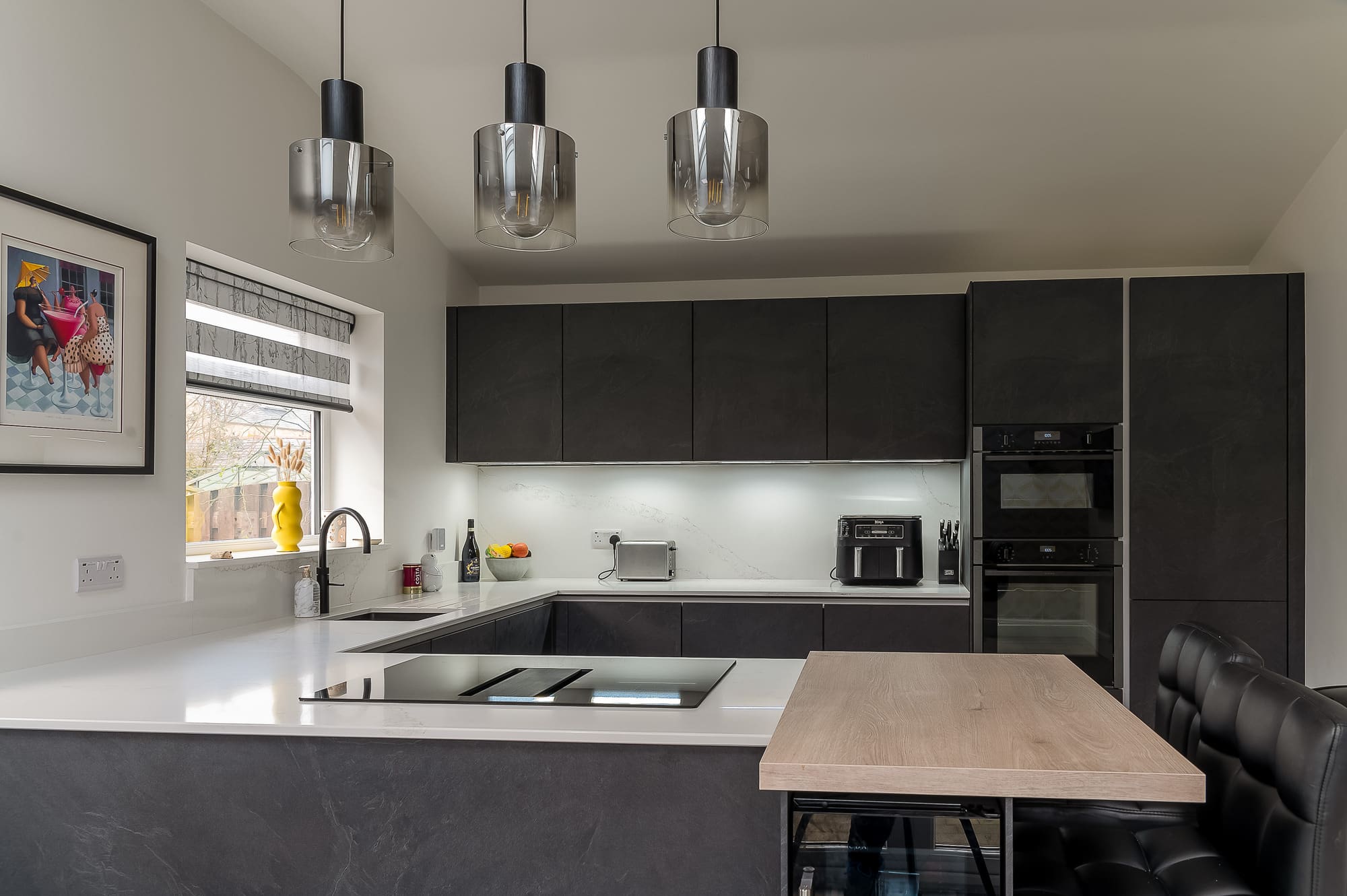 The standout feature of this kitchen is the textured black kitchen cabinetry. Its tactile finish creates depth and sophistication, offering a modern alternative to traditional flat matt surfaces. The dark kitchen tone is balanced with warm wood-effect worktops and soft grey seating, preventing the scheme from feeling heavy.