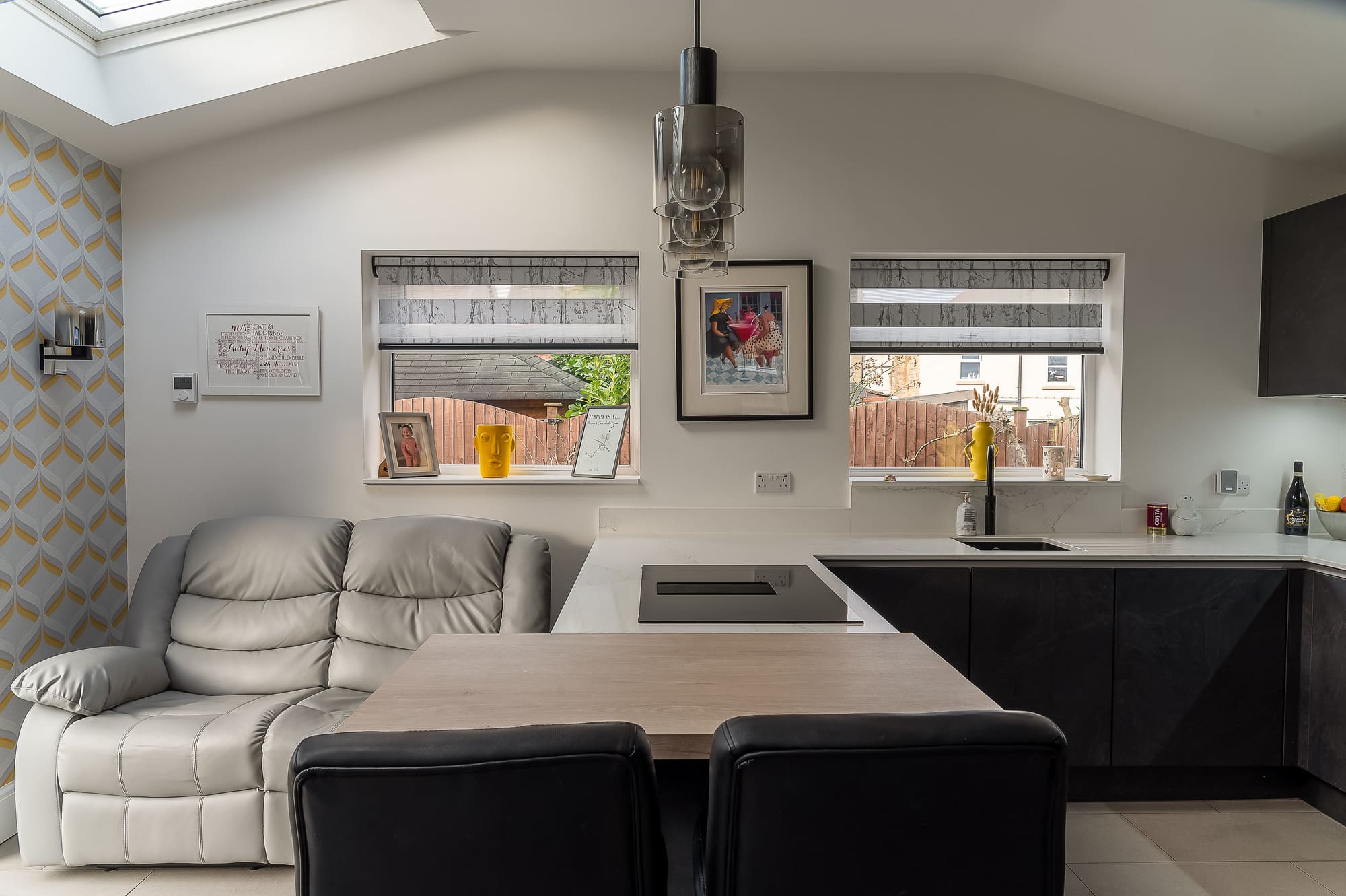 A comfortable adjoining seating area flows naturally from the kitchen, perfect for open-plan living.