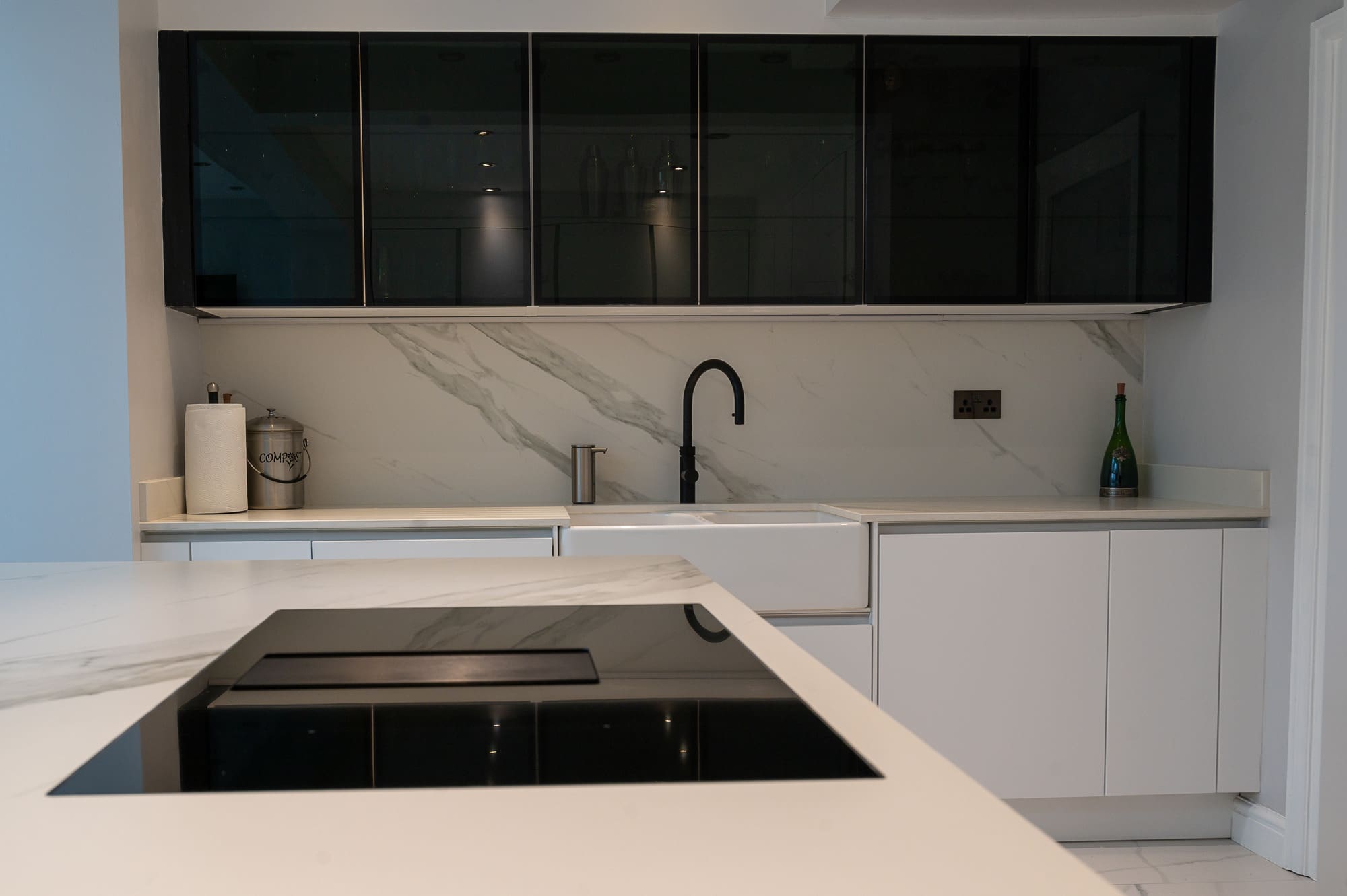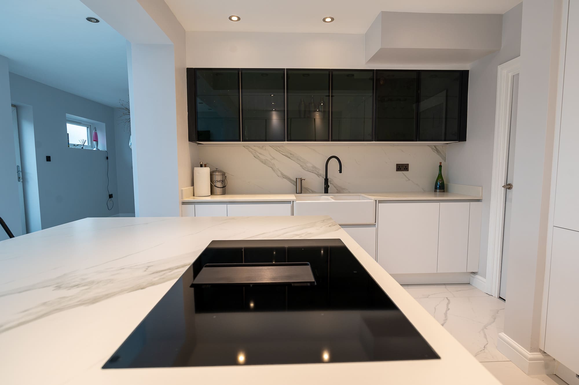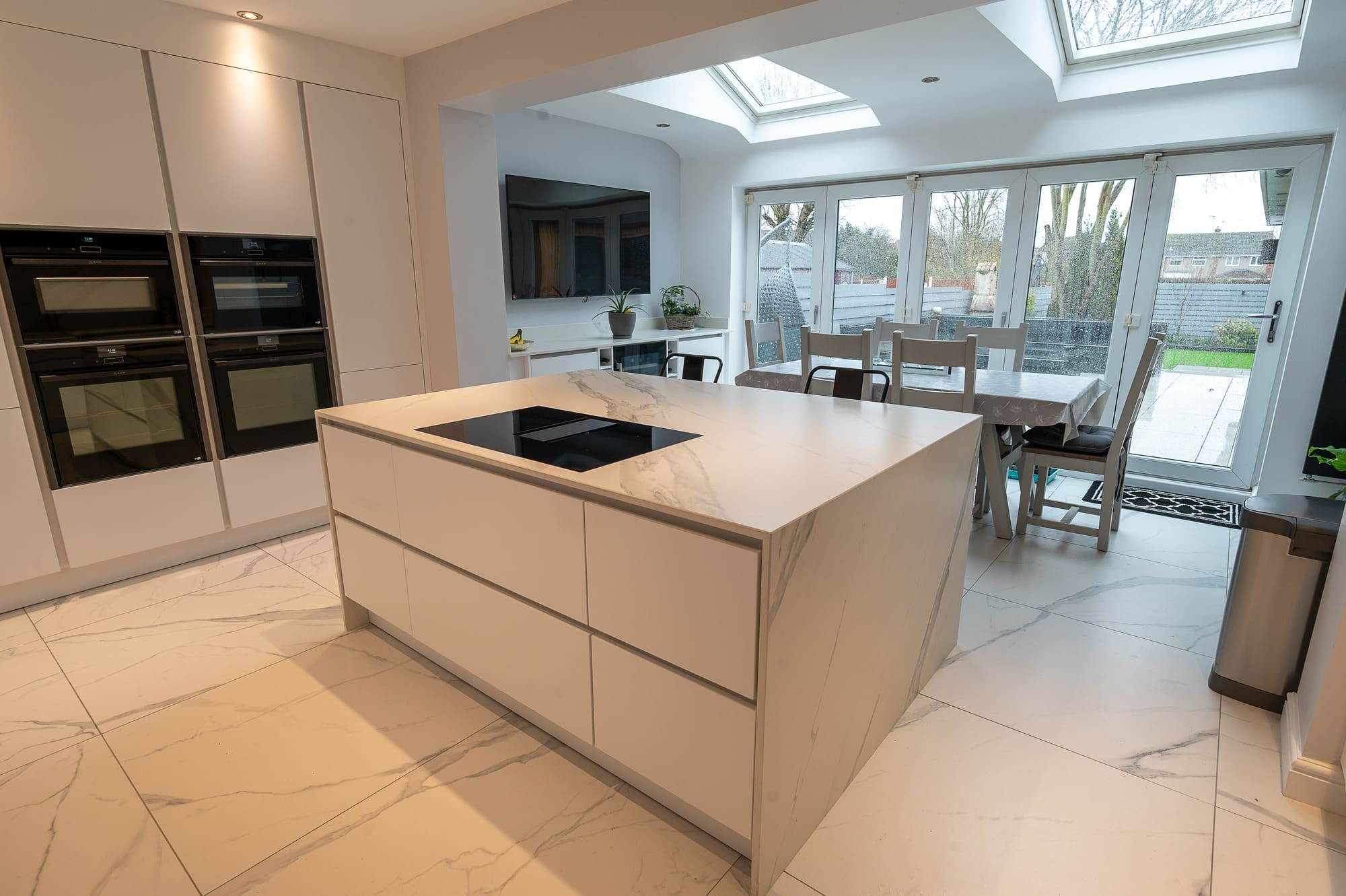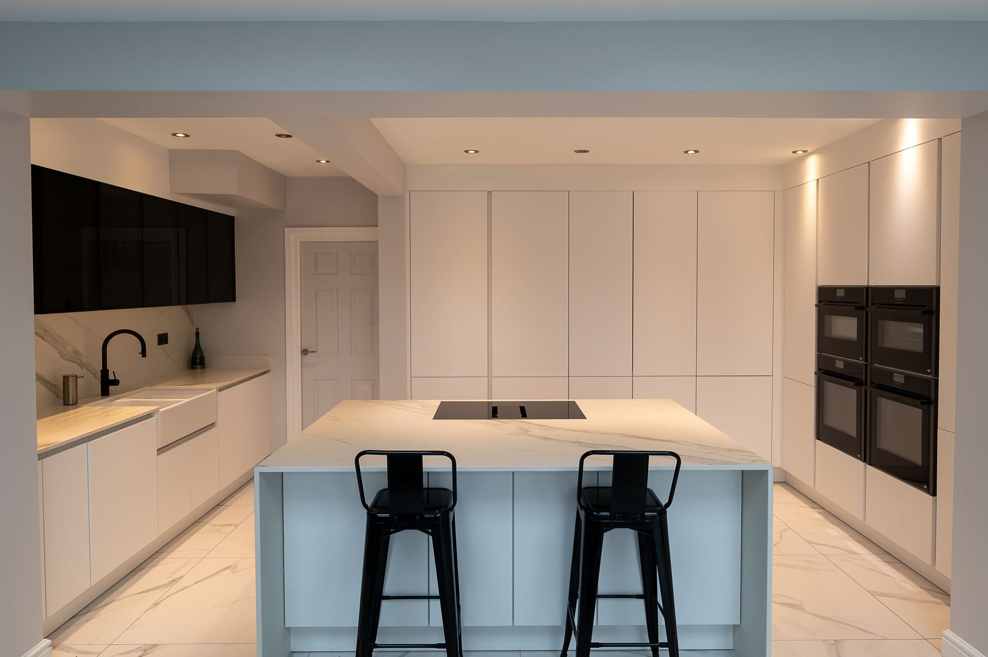 White worktops extend across the perimeter and onto the island, reinforcing the clean, unified aesthetic. Their slim profile enhances the contemporary look, while offering generous space for cooking, preparation, and display.