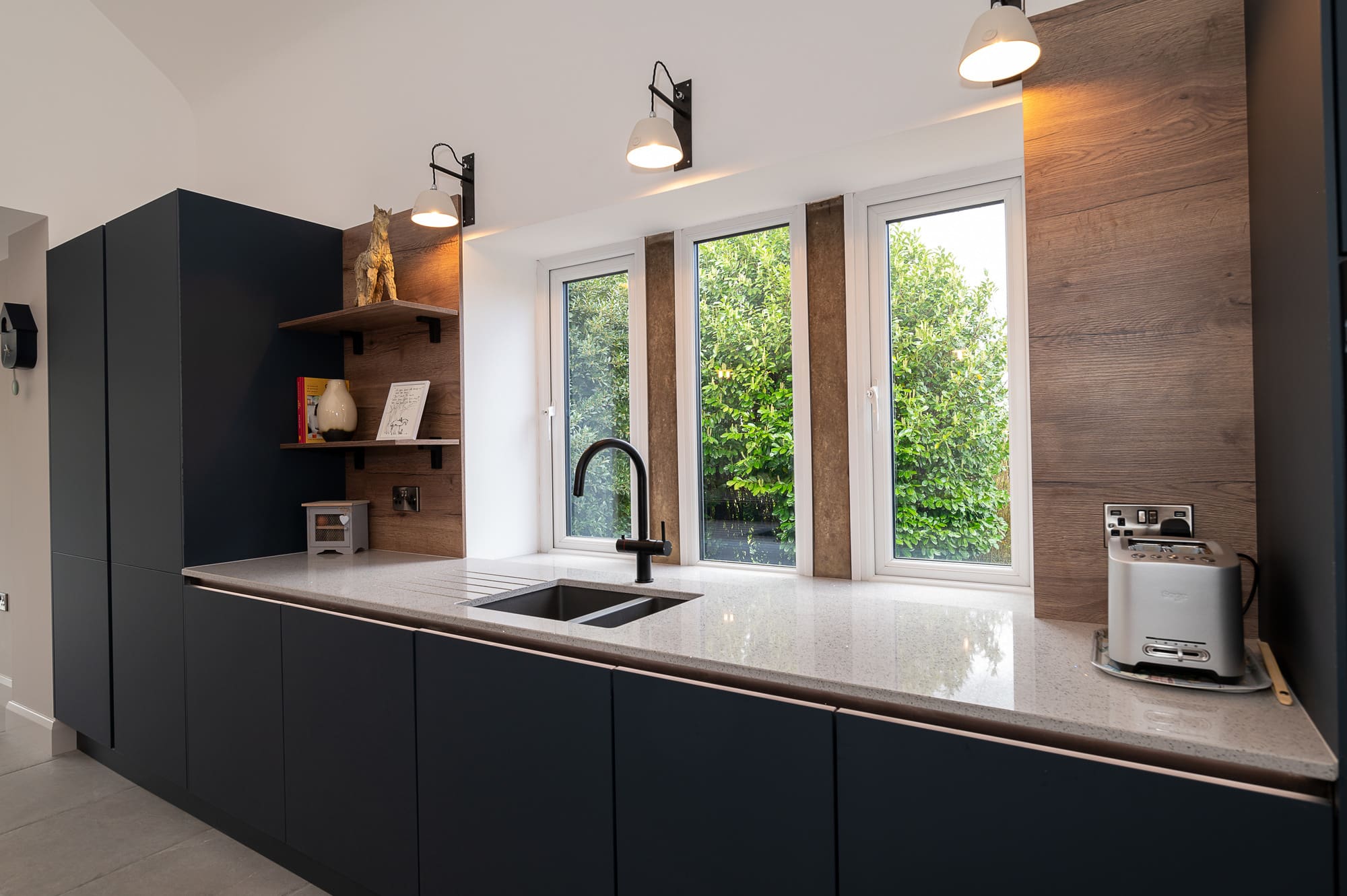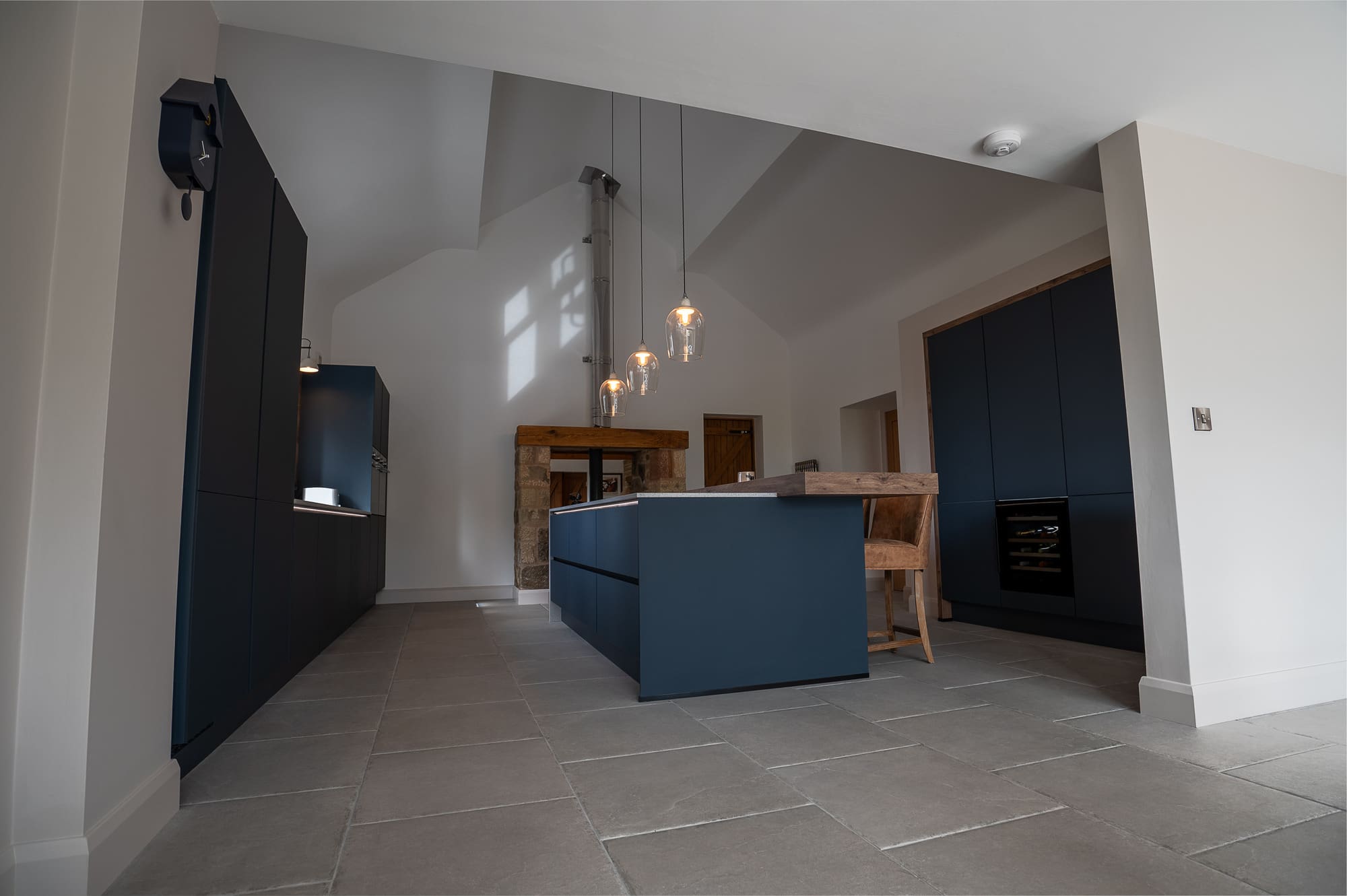 The handleless navy kitchen cabinetry provides a seamless, modern look across the base units, wall units, and full-height storage. A standout feature is the tall run with a timber surround, adding definition and giving the kitchen a bespoke furniture-like quality.