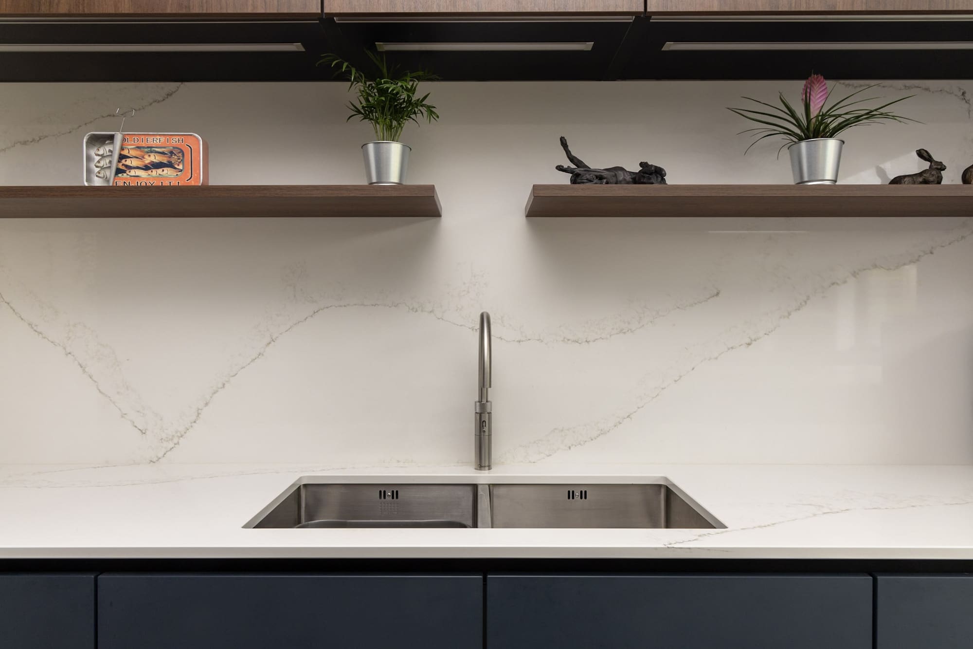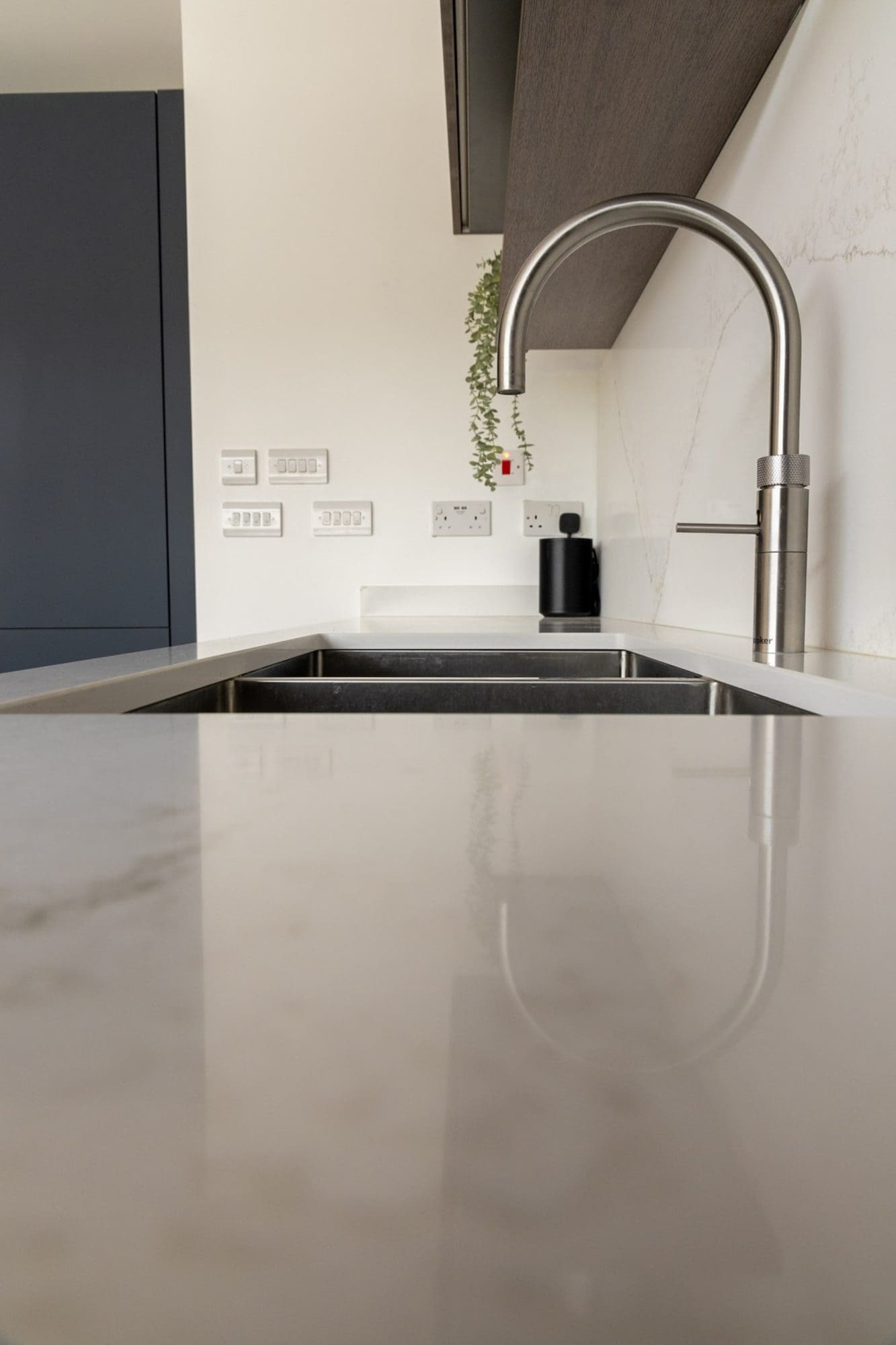 The light worktops offer crisp definition against the darker base units while maintaining a cohesive flow with the warm wood accents. Their polished finish enhances the modern feel, creating reflective surfaces that brighten the kitchen.
