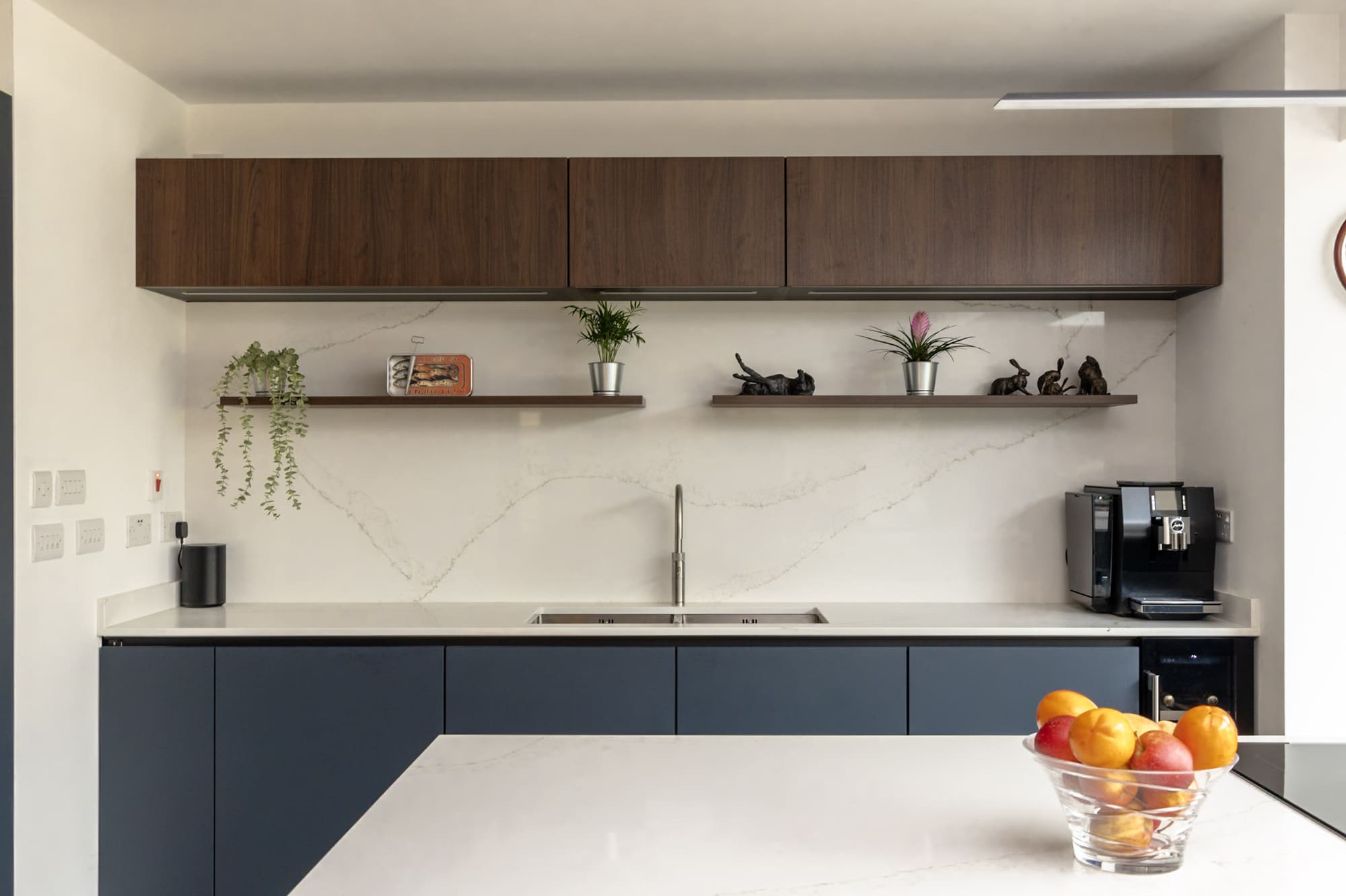 The handleless dark lower kitchen cabinetry provides the architectural backbone of the space. Its smooth, uninterrupted surfaces give the kitchen a clean and streamlined appearance. Above, the timber-effect cabinetry and shelving lighten the look and add material contrast.