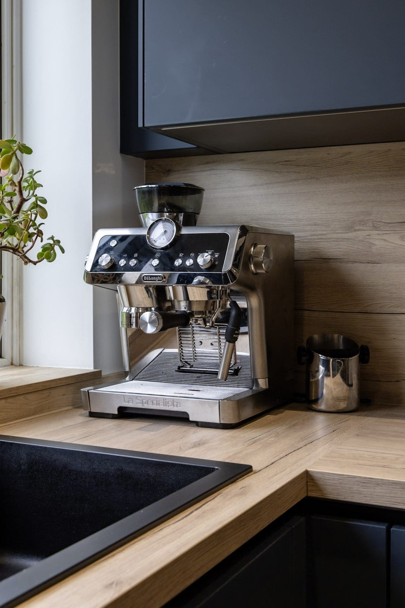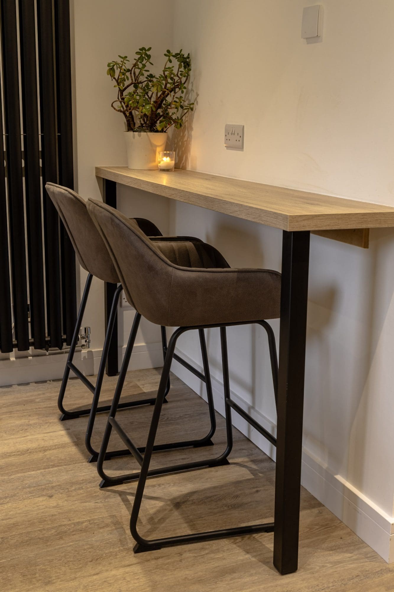 The overall look is modern and inviting, with the dark kitchen cabinetry providing a bold, contemporary foundation. The warm worktops and soft-toned walls introduce a gentle contrast, helping the space feel balanced rather than enclosed. The result is a kitchen that looks sophisticated while remaining perfectly suited to everyday living.