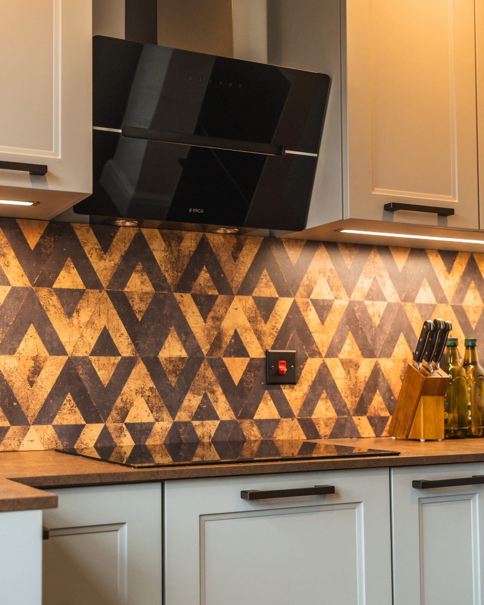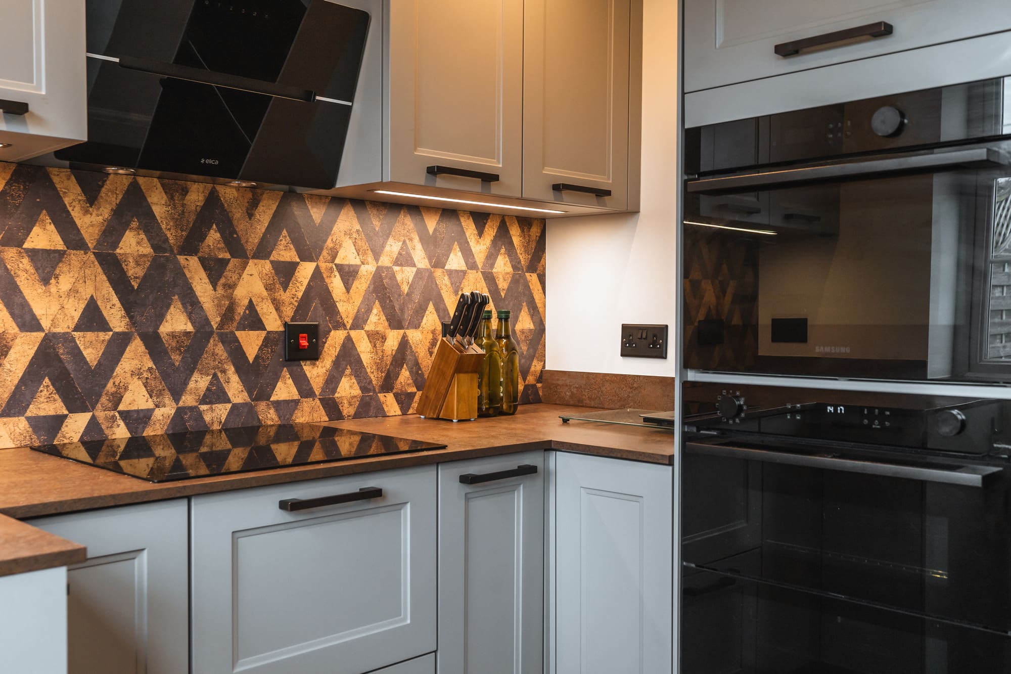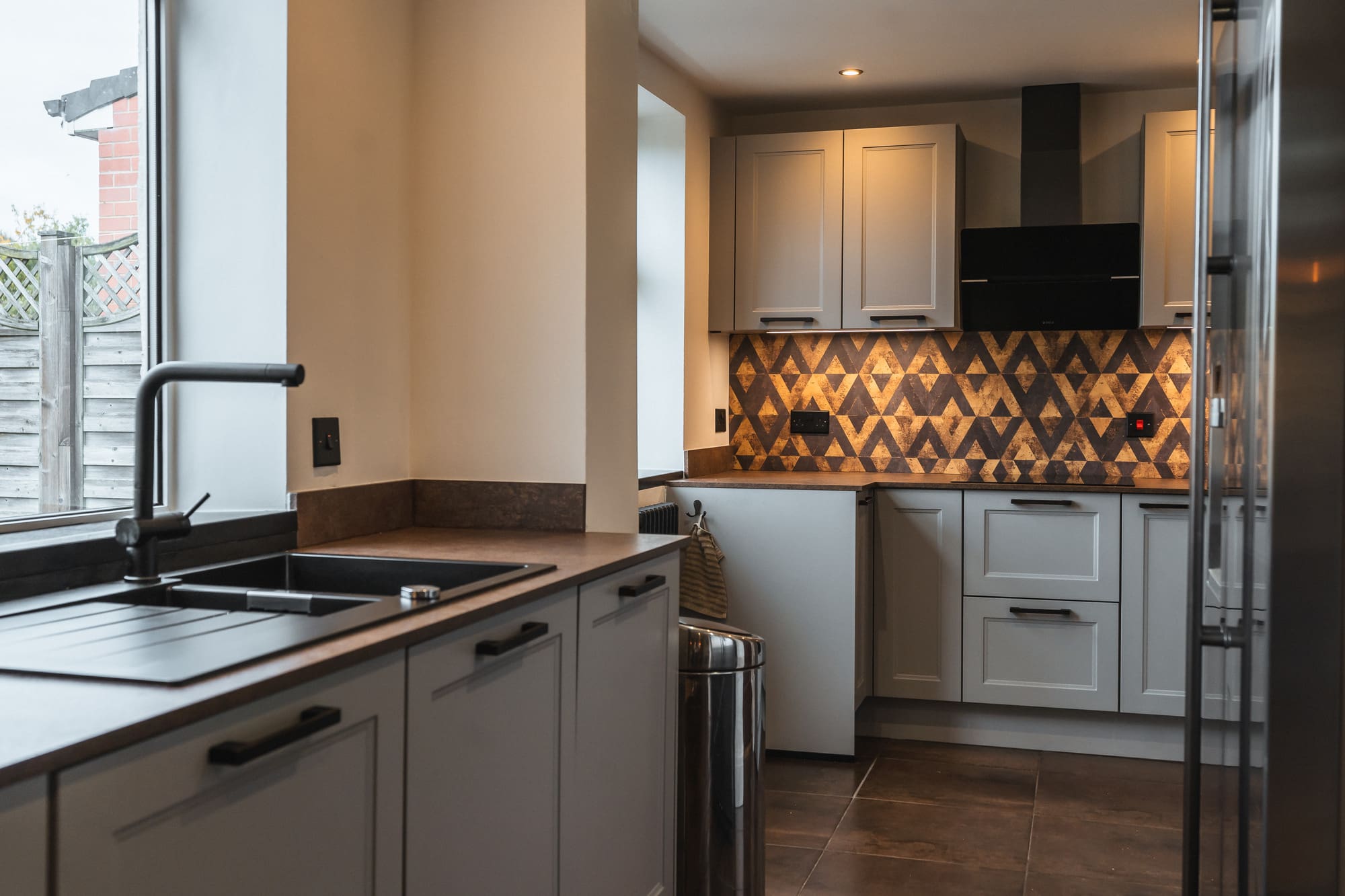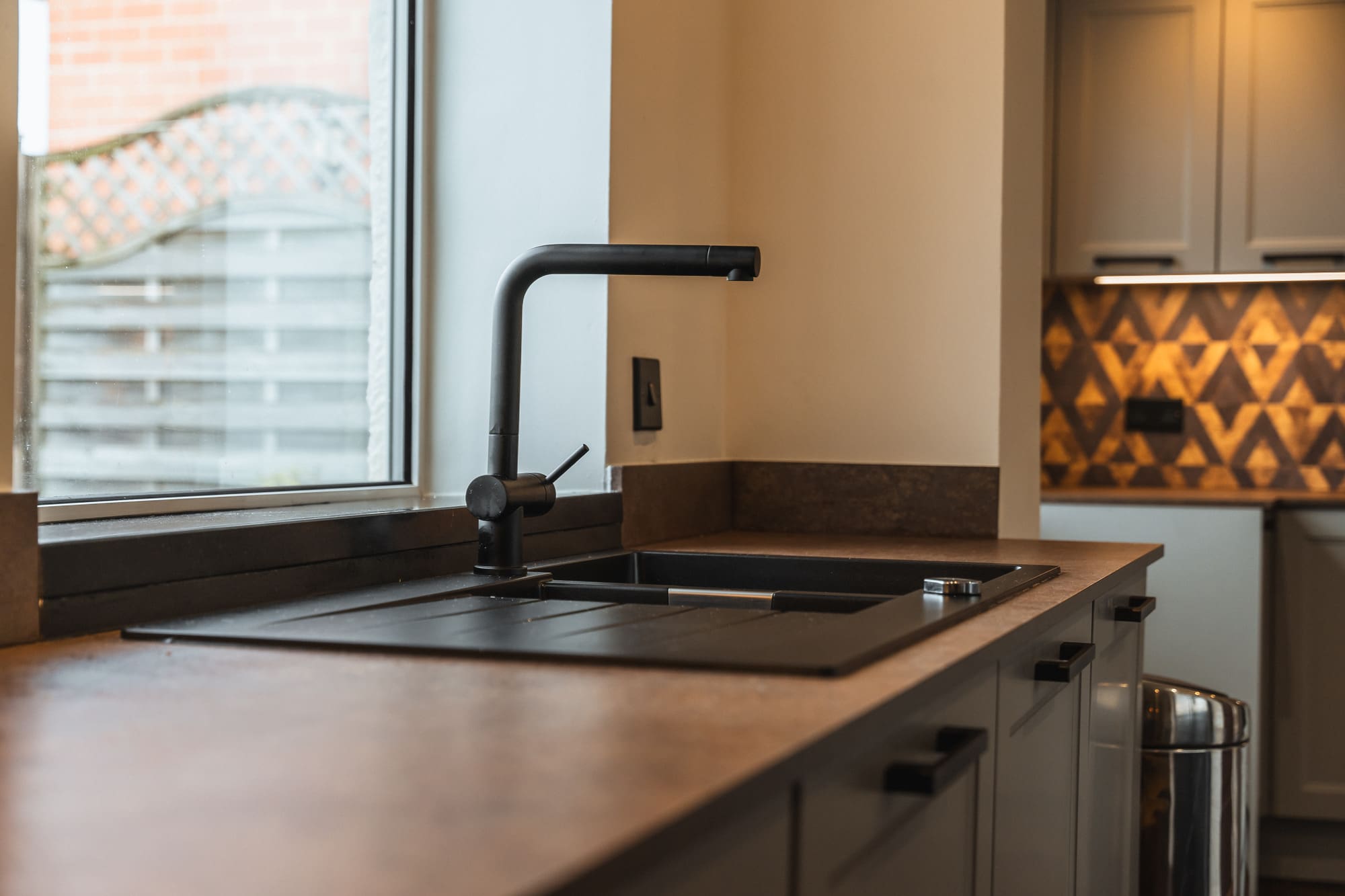 Warm under-cabinet lighting highlights the geometric splashback and enhances the earthy tones in the worktop. Black fixtures, including the tap and appliances, ground the design and create a balanced contrast against the soft grey cabinetry.