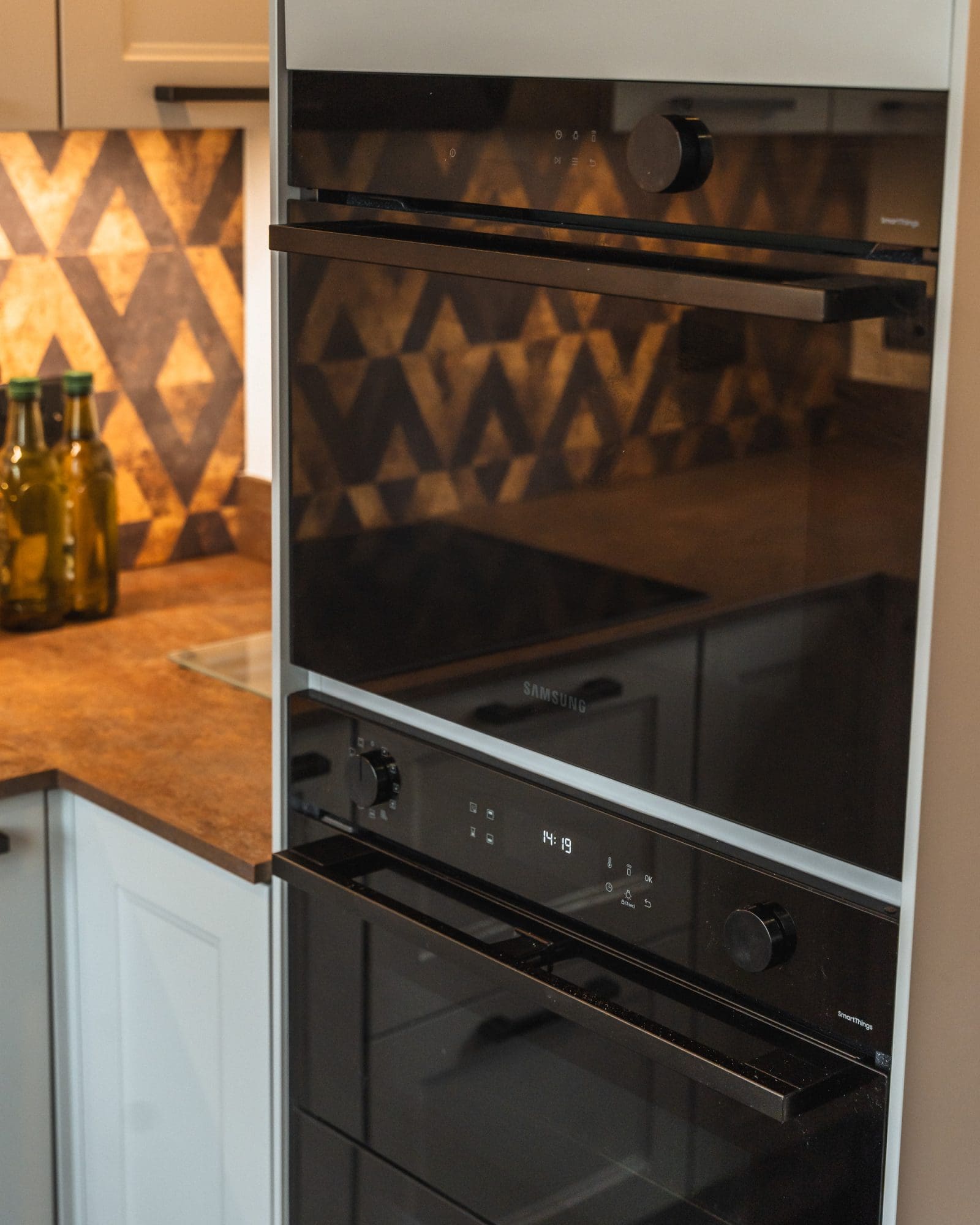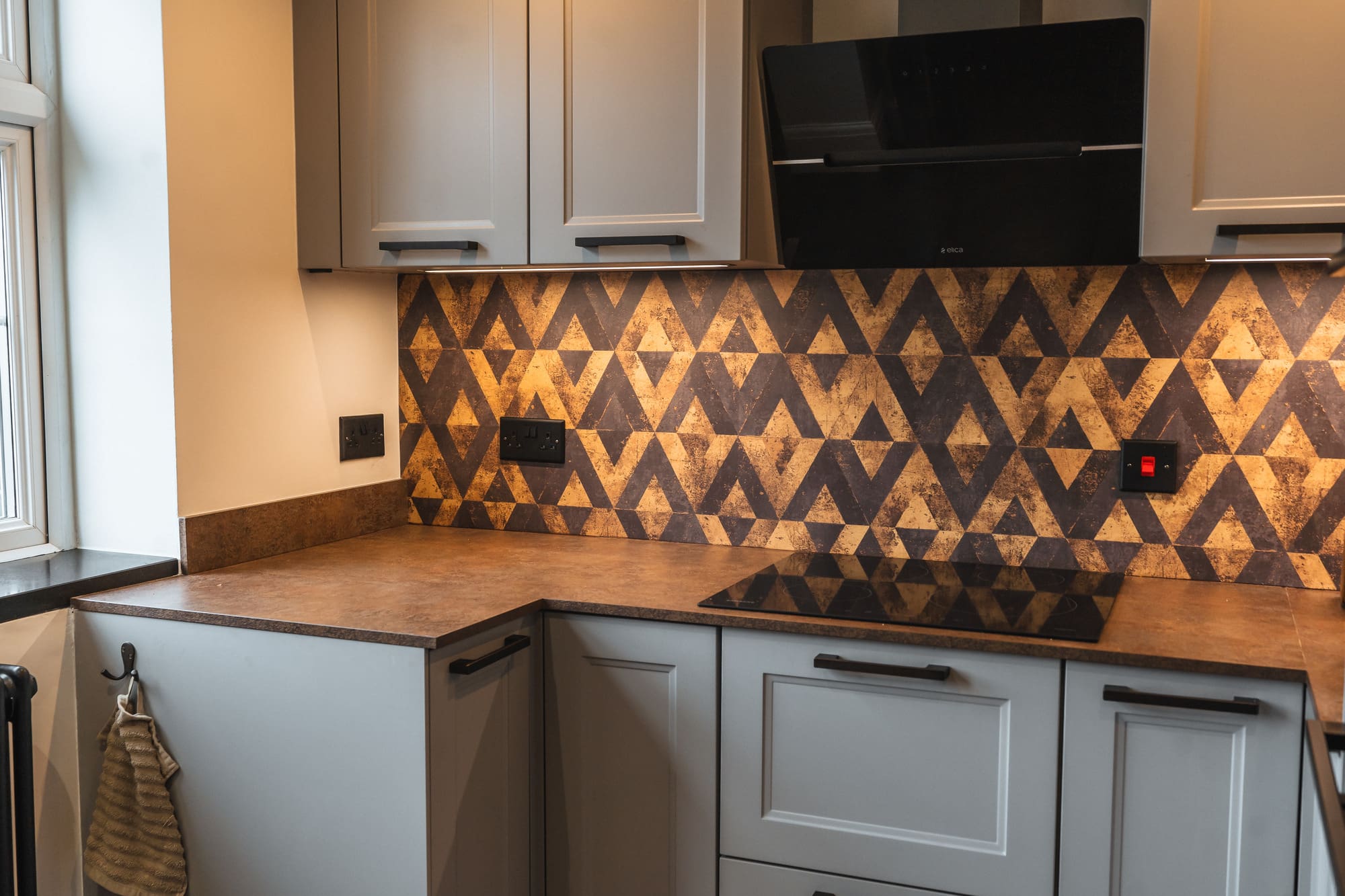 The geometric splashback becomes the defining visual feature of this Kitchen Project. Its pattern injects energy and personality, catching the light beautifully and adding a contemporary lift to the classic shaker style.