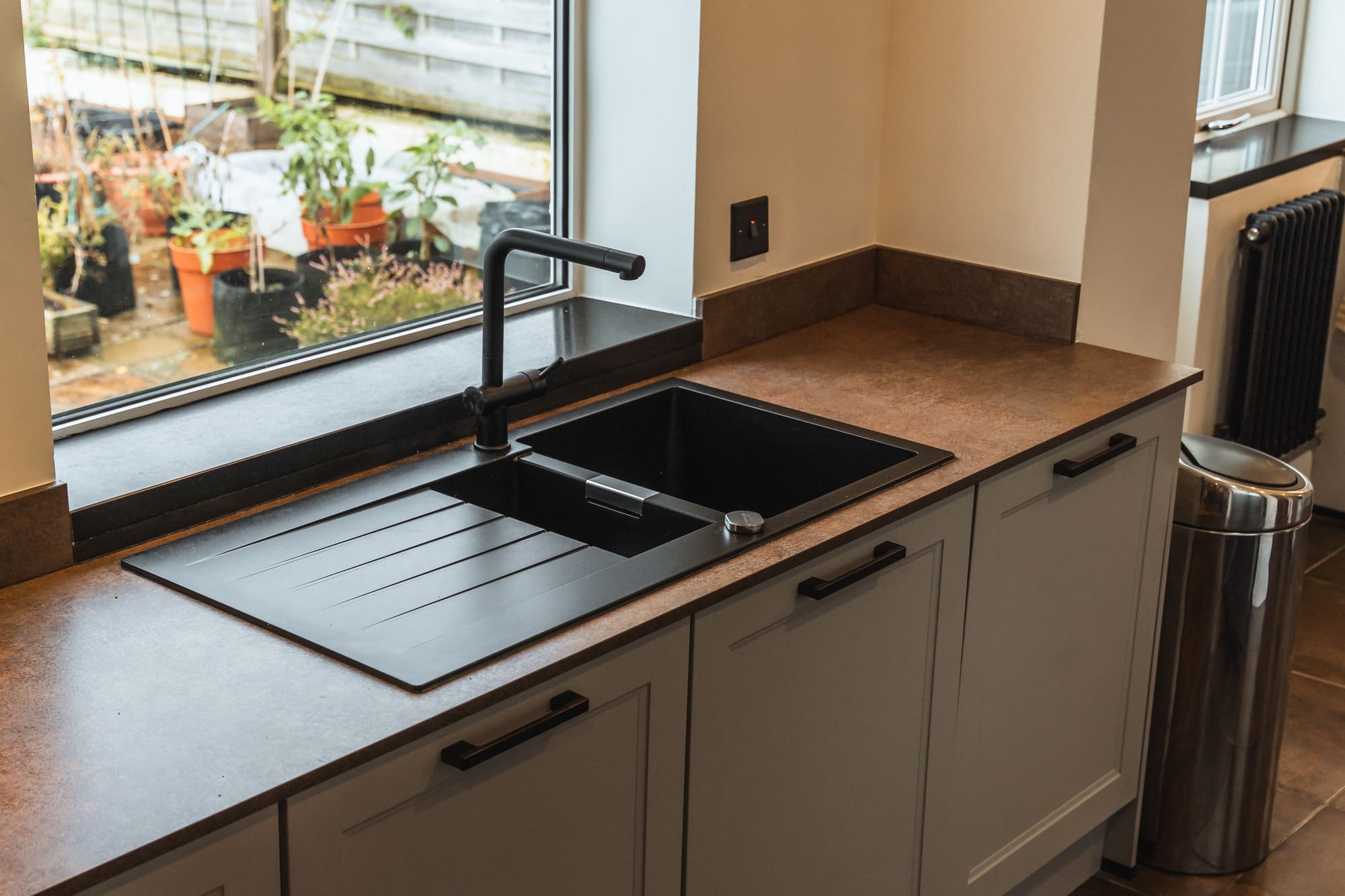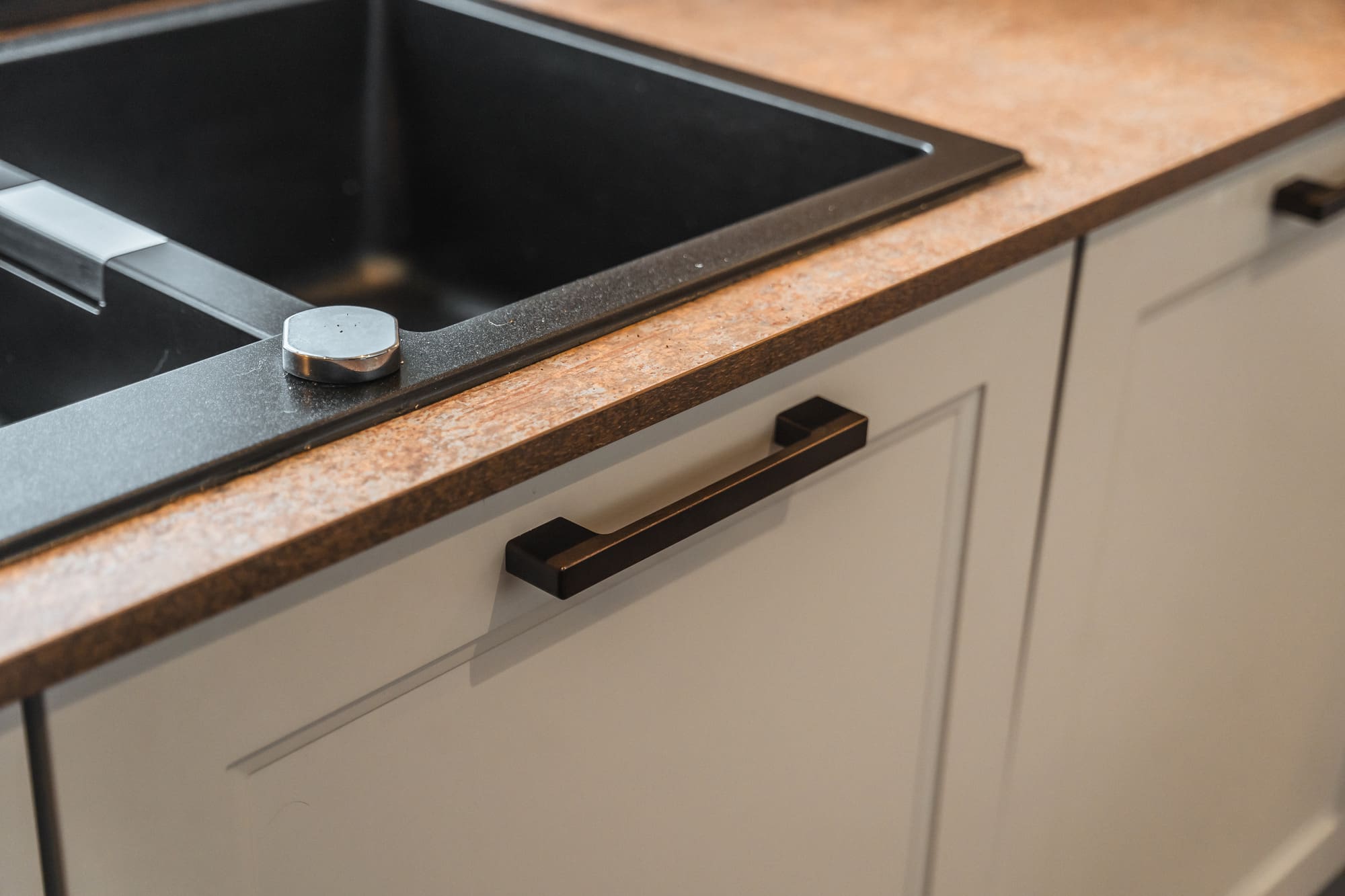 The warm stone-effect worktops soften the cooler tones of the cabinetry and enhance the welcoming feel of the kitchen. Their durable, textured finish provides a practical prep surface suited to busy daily use.